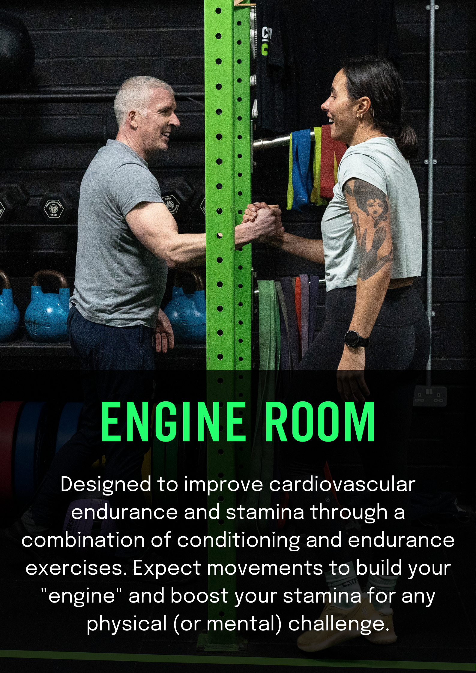 Engine Room classes are designed to improve cardiovascular endurance and stamina through a combination of intense metabolic conditioning and endurance exercises. Expect a challenging mix of rowing, running, cycling and weighted movements to build your "engine" and boost your stamina for any physical (or mental) challenge.