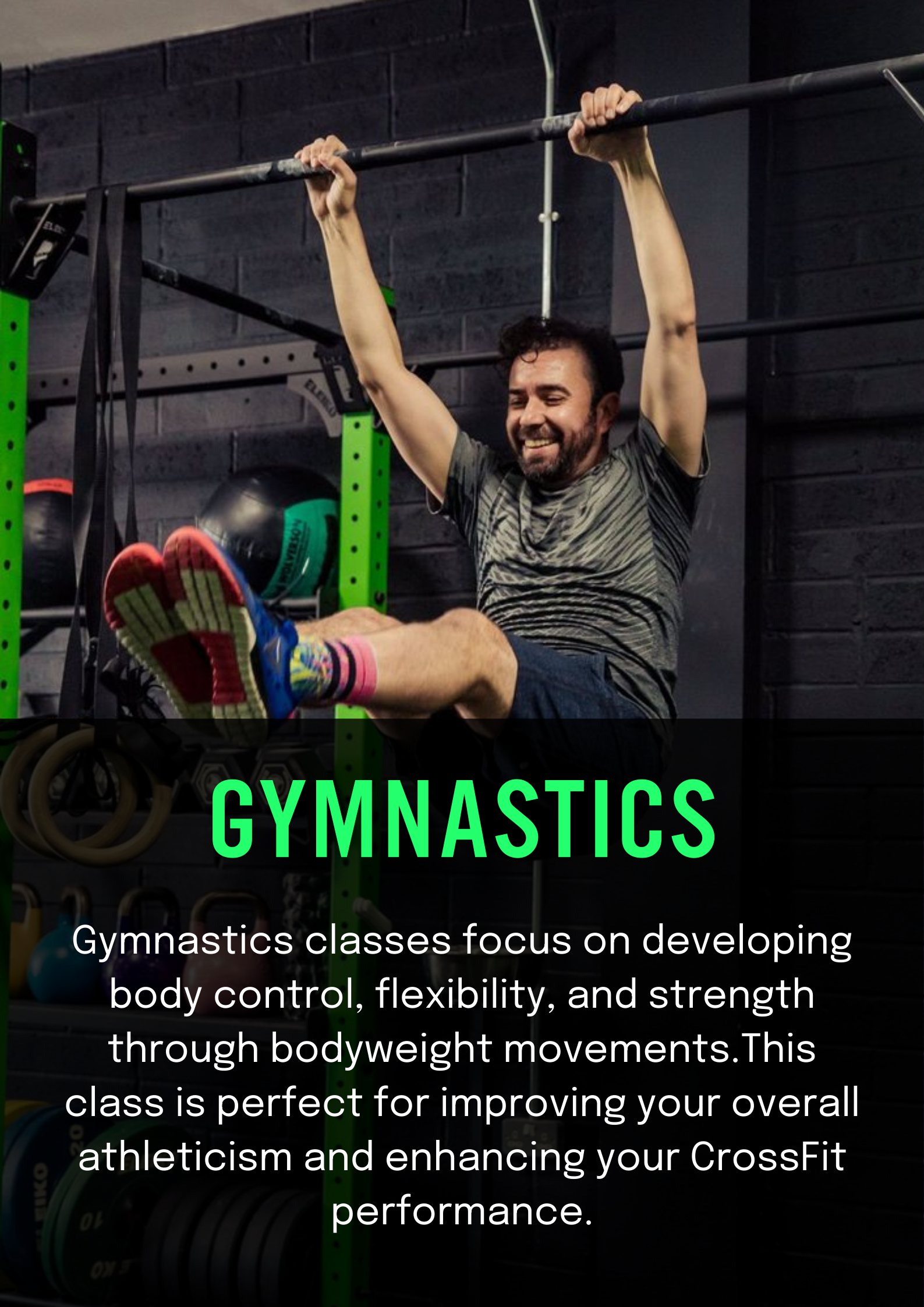 Gymnastics classes focus on developing body control, flexibility, and strength through bodyweight movements. You’ll learn skills like handstands, rings and bar work, with an emphasis on building foundational techniques. This class is perfect for improving your overall athleticism and enhancing your CrossFit performance, regardless of your experience level.
