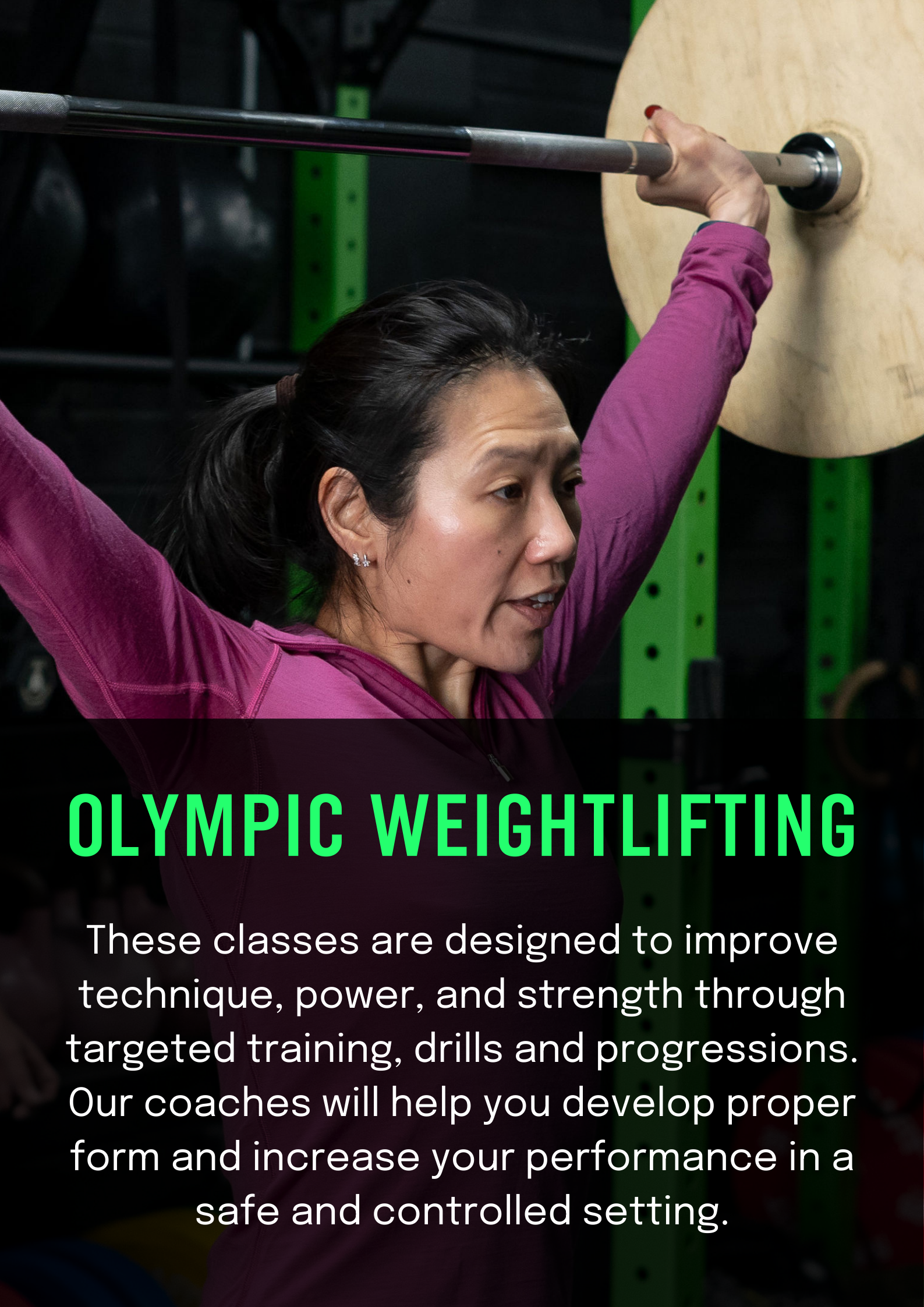 Our Olympic Weightlifting classes focus on the two key lifts: the snatch and the clean & jerk. These classes are designed to improve technique, power, and strength through targeted training, drills and progressions. Whether you’re new to weightlifting or looking to refine your skills, our coaches will help you develop proper form and increase your performance in a safe and controlled setting.